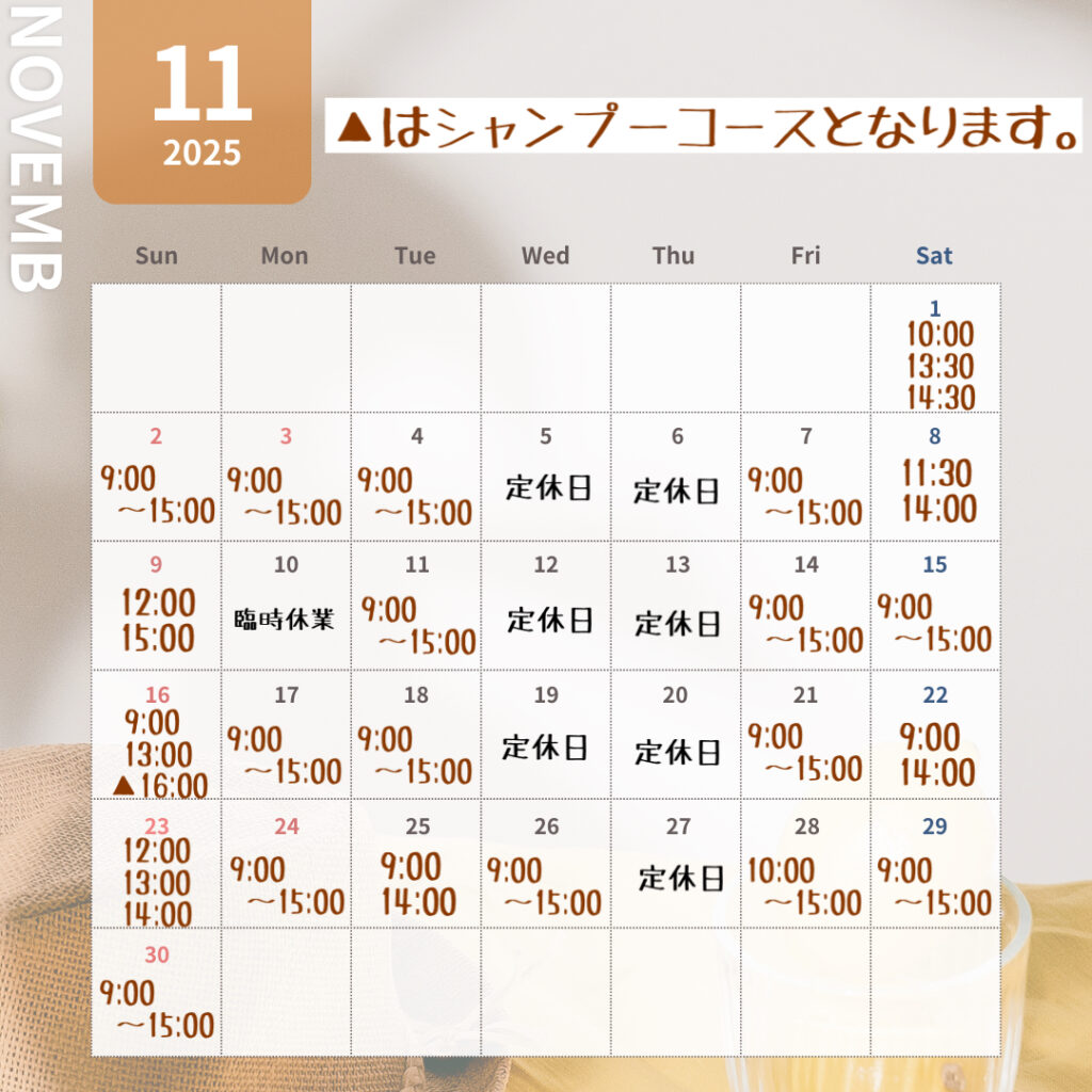 最新 11月ご予約状況カレンダー🍁 2025年10月24日 News最新の11月のご予約状況です✨️LINEまたはお電話にてご予約受付中です!お気軽にお問い合わせくださいませ☺️TEL:072-320-9204・